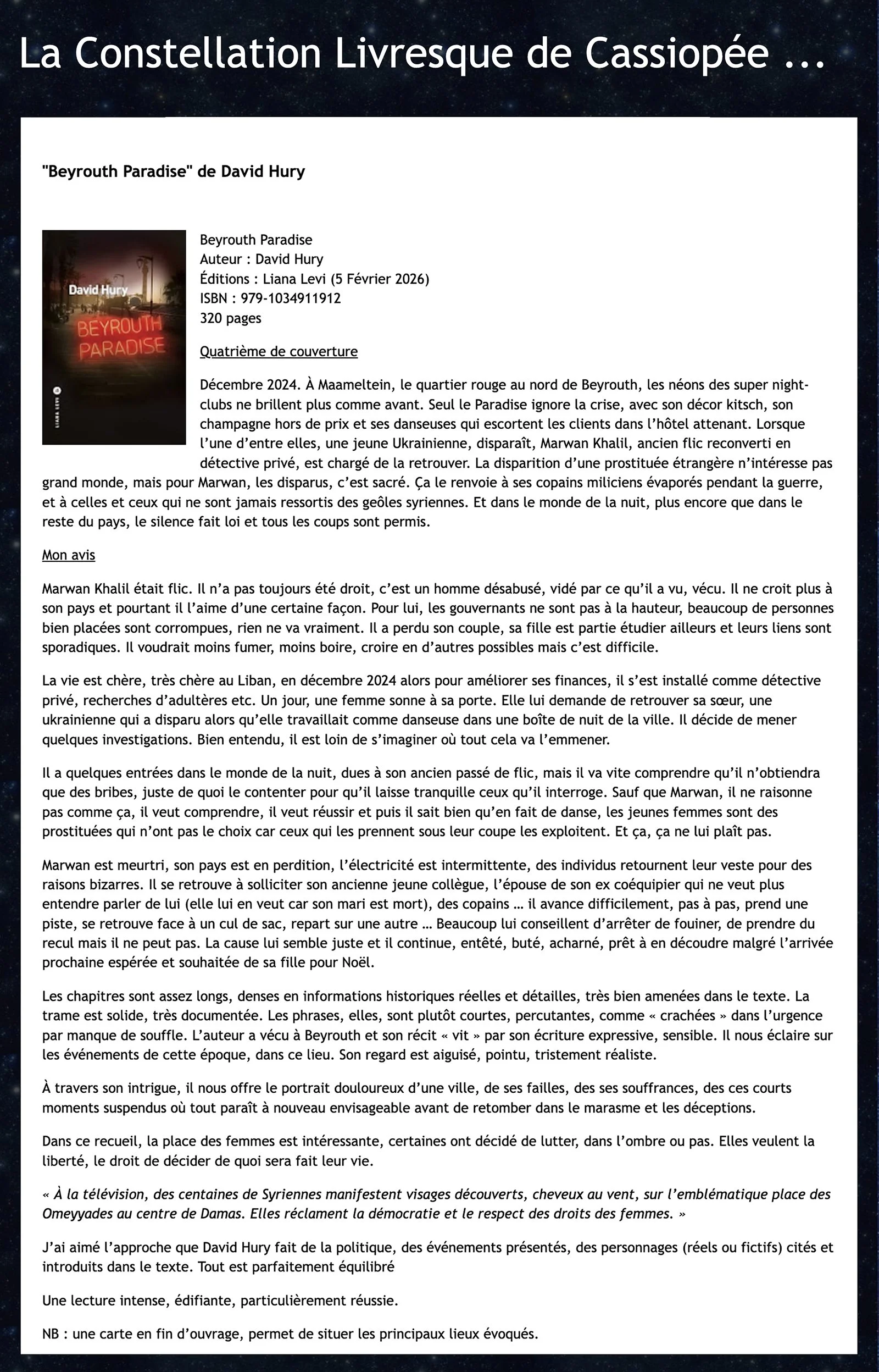 Cassiopée avait déjà bien aimée Beyrouth Forever, elle remet ça avec Beyrouth Paradise qui vient de sortir hier aux éditions Liana Levi. Merci beaucoup!