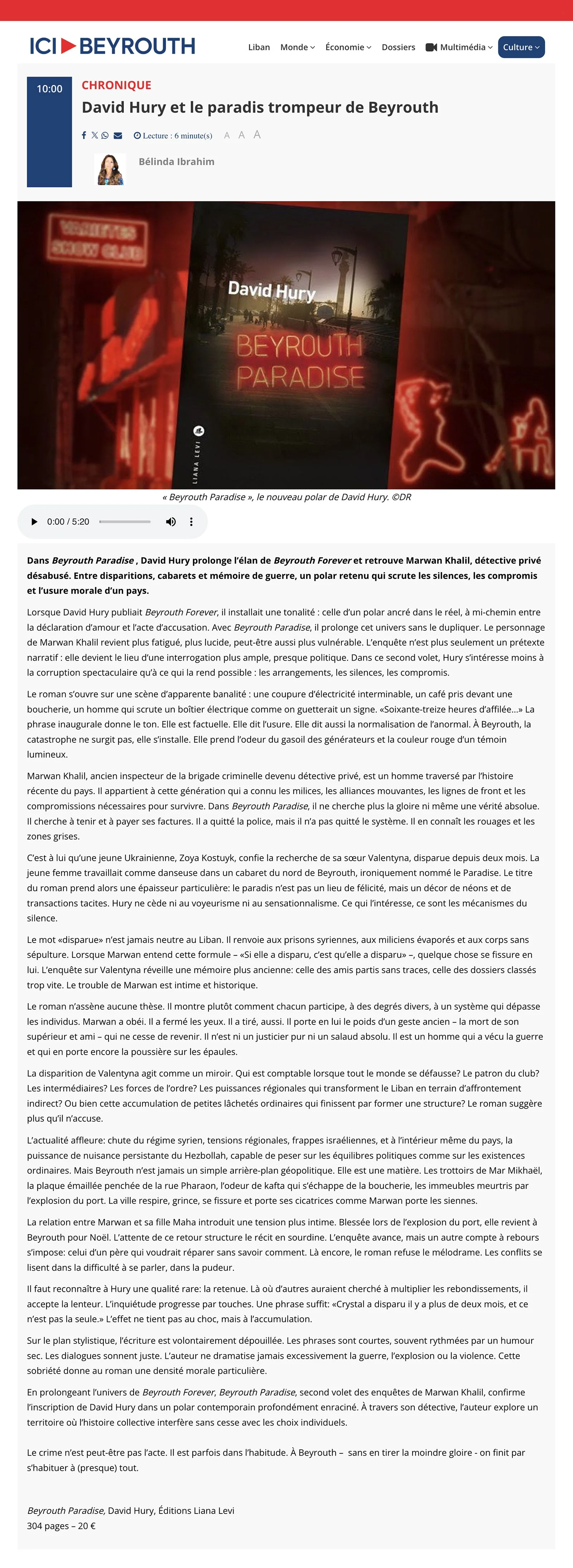 Première critique dans un média libanais, le stress! Surtout quand un “ajnabé” s’attaque à la réalité libanaise… Dans Ici Beyrouth, Bélinda Ibrahim lit entre les lignes de Beyrouth Paradise (éd. Liana Levi) et elle sent ce que j’ai essayé de faire: un roman qui refuse le mélodrame.