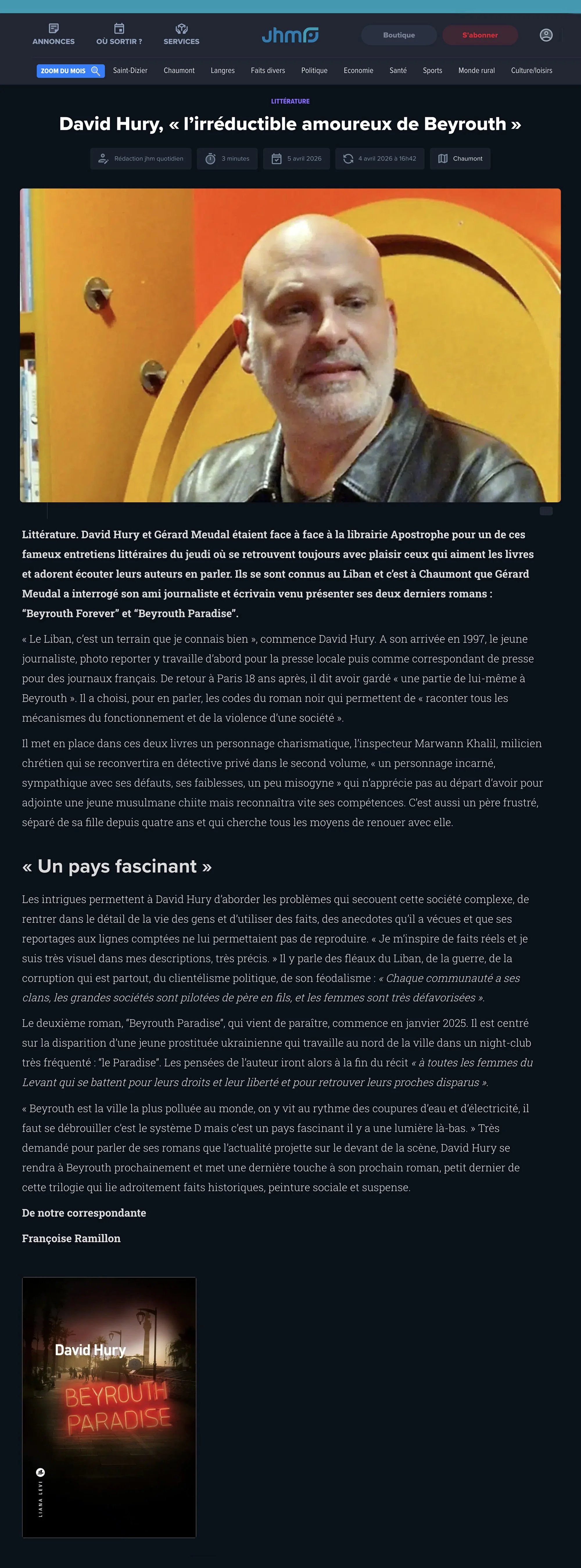 Je ne le savais pas, mais lors de la rencontre à Chaumont à la Librairie Apostrophe modérée par Gérard Meudal, une journaliste du Journal de la Haute-Marne (JHM) – Françoise Ramillon – était là et vient de publier un article sur l’événement. Bonne surprise! Ce soir-là, on avait parlé Beyrouth Paradise, paru en février aux éditions Liana Levi, mais aussi du Liban et de la terrible actualité…