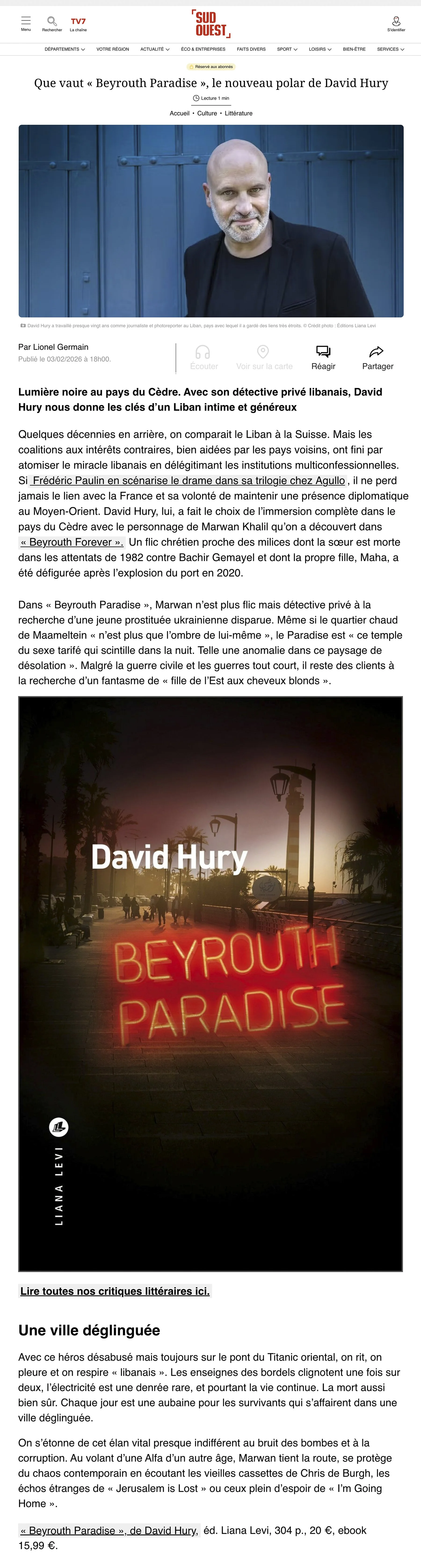 Voici un très beau papier dans Sud-Ouest, concis, qui pointe exactement ce que j’avais en tête avec Beyrouth Paradise qui sort aux éditions Liana Levi le 5 février prochain! Lionel Germain a tout résumé en 2 mots: Beyrouth est un “Titanic oriental”.
